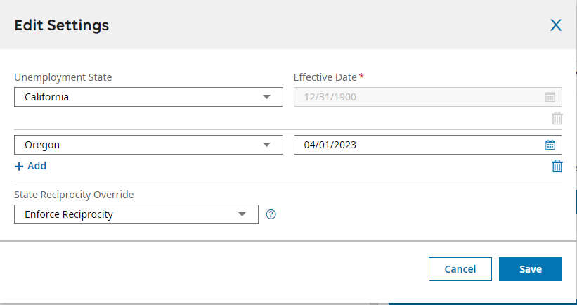 - Click on the Edit link and add your new state settings. In this screenshot, the employee was in California until 4/1/2023, when their unemployment state was overridden to Oregon.